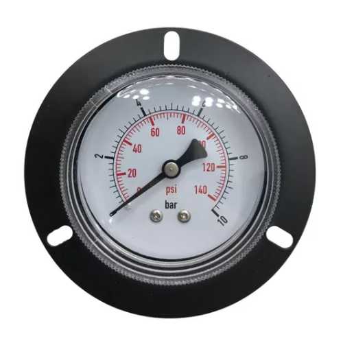 Manômetro Painel com Visor de 63mm e Flange, com escala dupla 0-10 Bar e 0-140 PSI, com rosca 1/4.